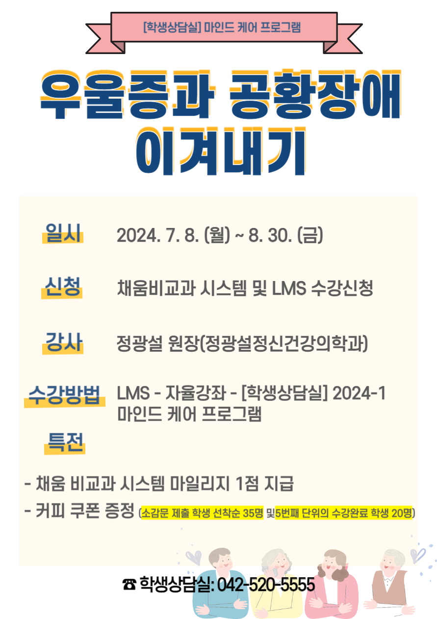 제목[학생상담실]2024-1 마인드 케어 프로그램(우울증과 공황장애 이겨내기)
