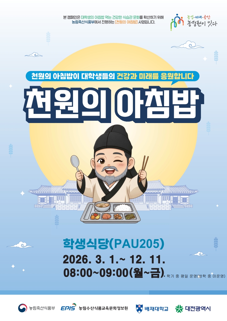 2026학년도 천원의 아침밥 사업 시행을 다음과 같이 안내하오니 재학생들의 많은 이용 바랍니다.