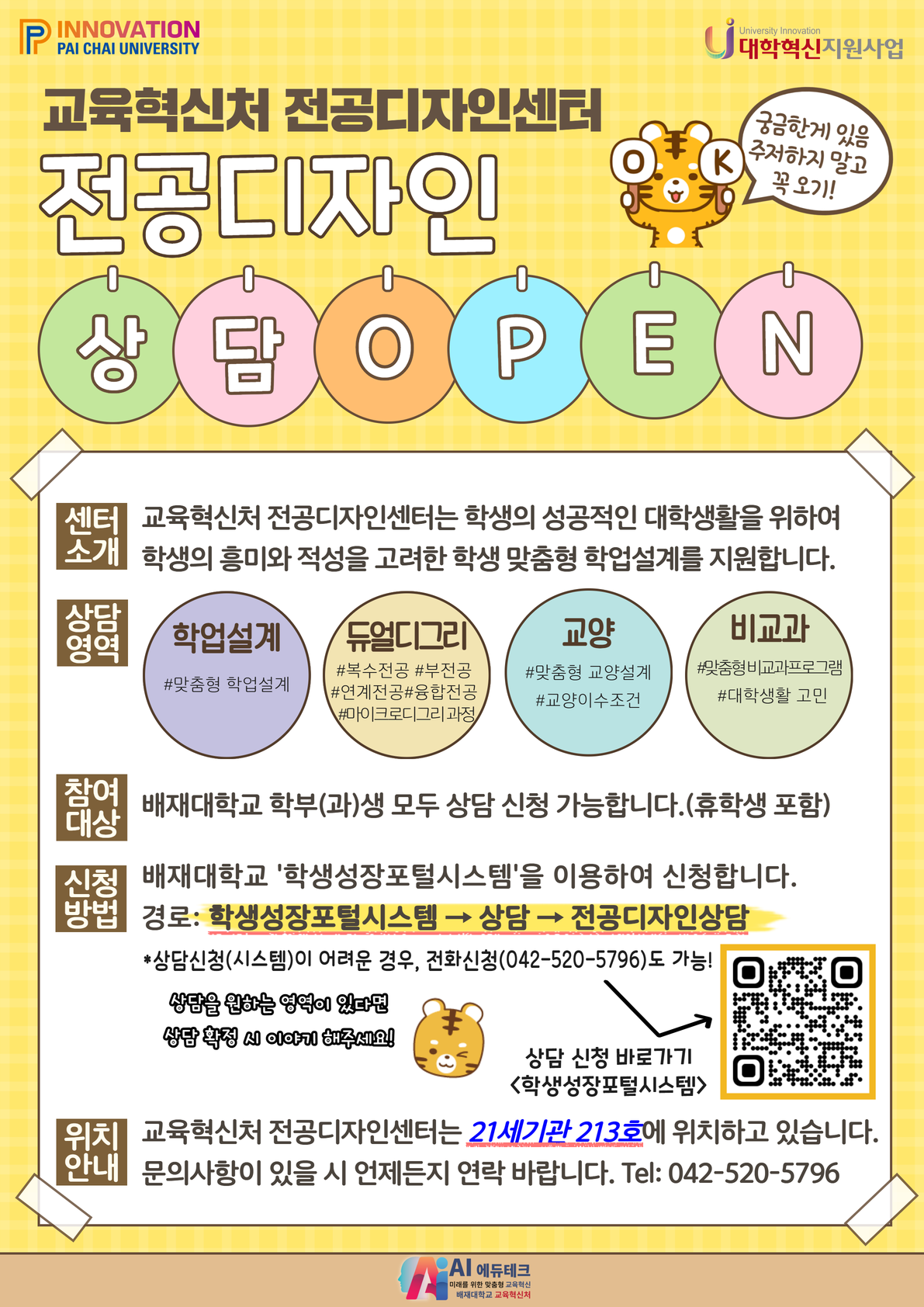 교육혁신처 전공디자인센터에서 학생의 성공적인 대학생활을 위하여 학생의 흥미와 적성을 고려한 학생 맞춤형 학업설계를 지원합니다.
