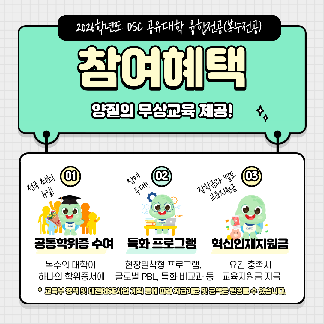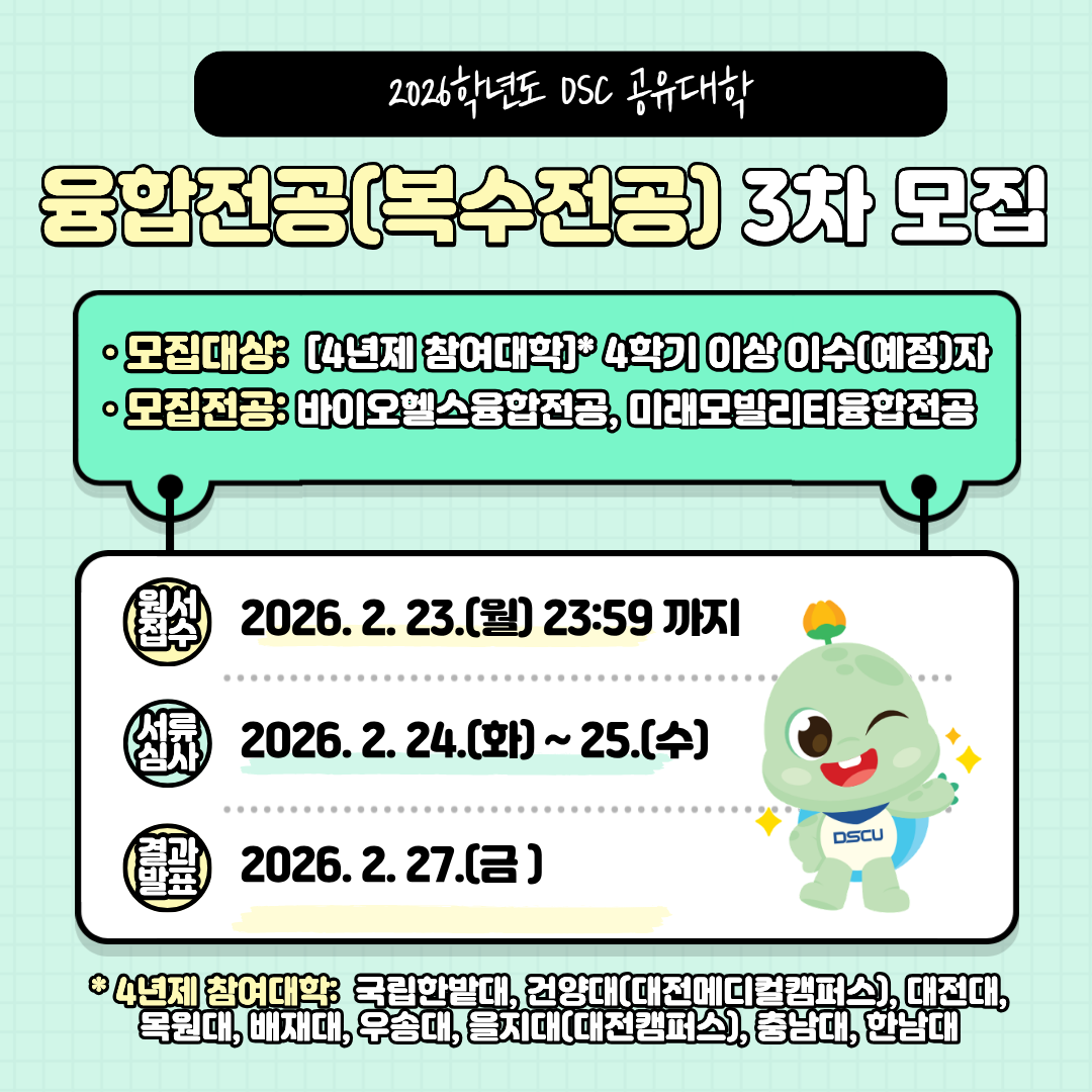 제목2026학년도 1학기 DSC공유대학(대전형) 융합전공(복수전공) 학생 3차 모집