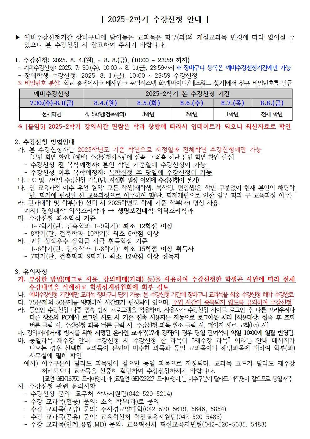 2025-2학기 수강신청(예비수강신청 및 강의시간편람 포함) 일정 안내