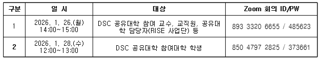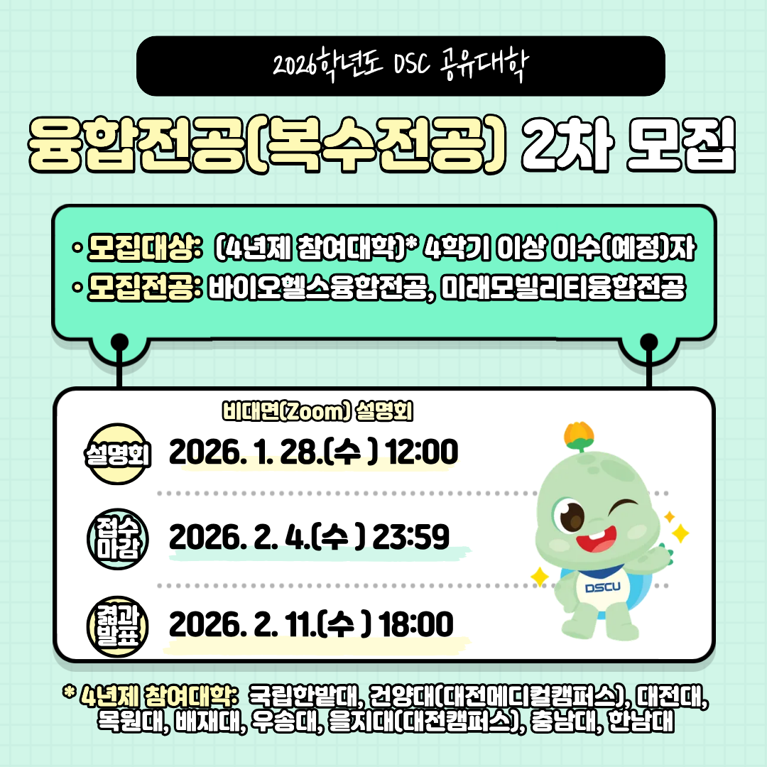 DSC공유대학(대전형)에서는 2026학년도 DSC공유대학 융합전공 참여학생을 다음과 같이 추가 모집하고 설명회를 개최하고자 합니다.