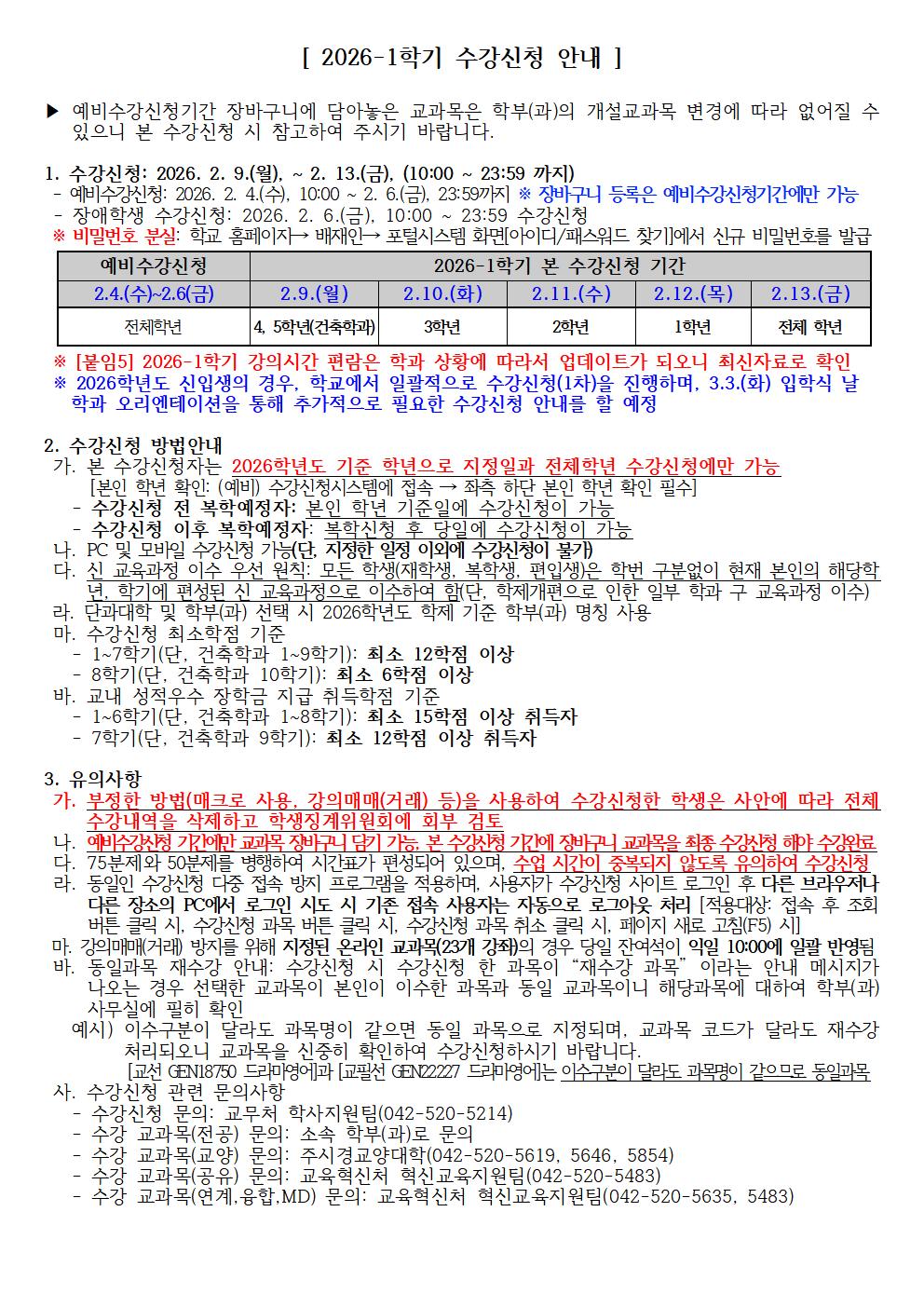 2026-1학기 수강신청(예비수강신청 및 강의시간편람 포함) 일정 안내