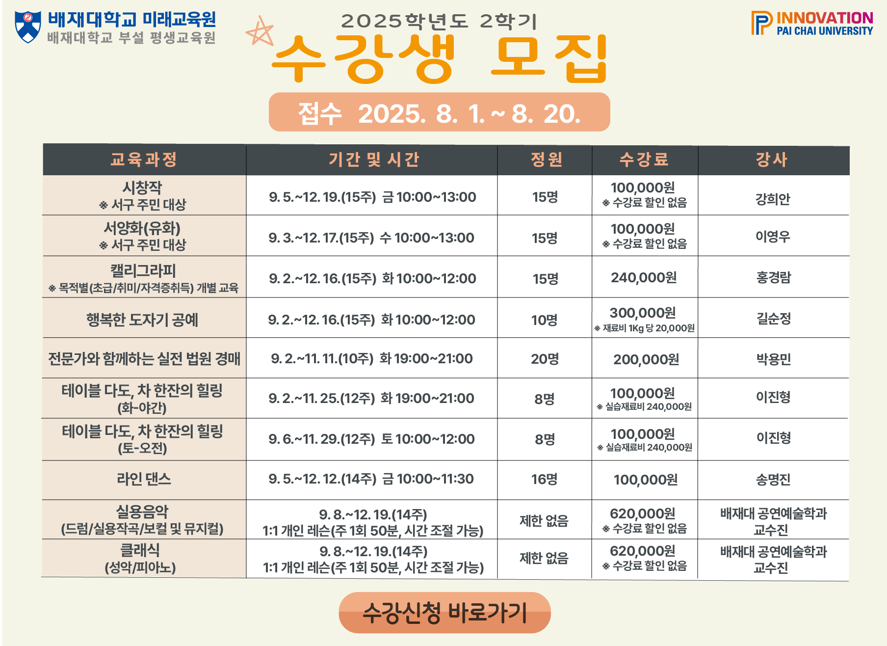 제목[미래교육원] 2025학년도 2학기 일반교육과정 개설 강좌 수강생 모집 안내
