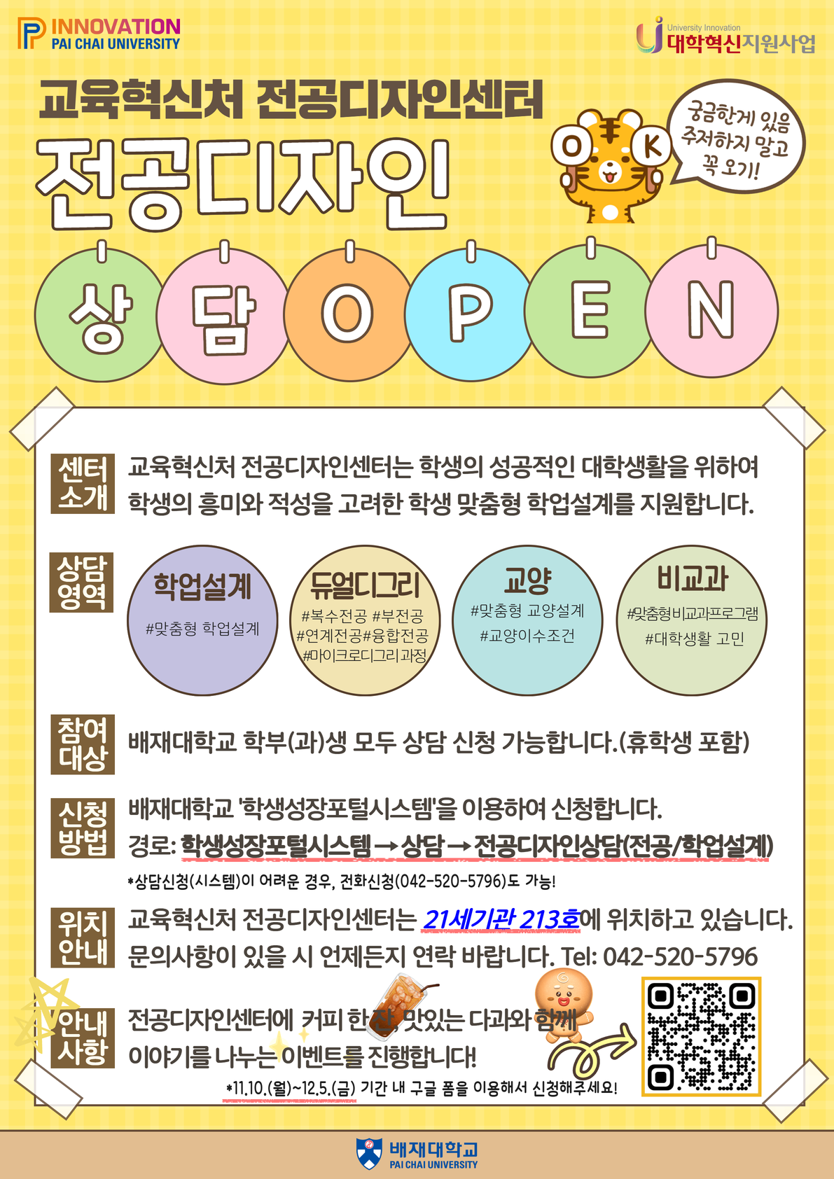 교육혁신처 전공디자인센터에서 학생의 성공적인 대학생활을 위하여 학생의 흥미와 적성을 고려한 학생 맞춤형 학업설계를 지원합니다.