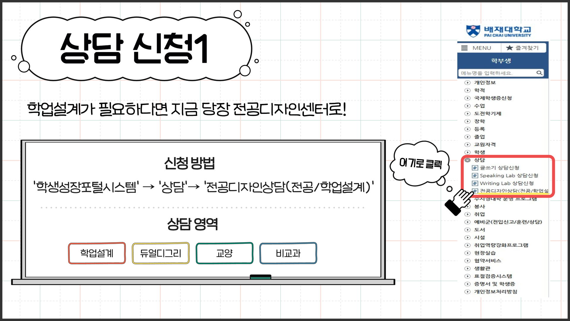1. 학업설계 신청 바로가기: 학생성장포털시스템(https://portal.pcu.ac.kr/) *신청방법 아래 참고 또는 전화(042-520-5796)
