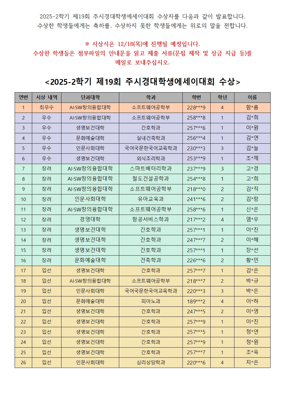 [교육혁신처] 대학혁신지원사업_2025-2학기 제19회 주시경대학생에세이대회 수상자 안내