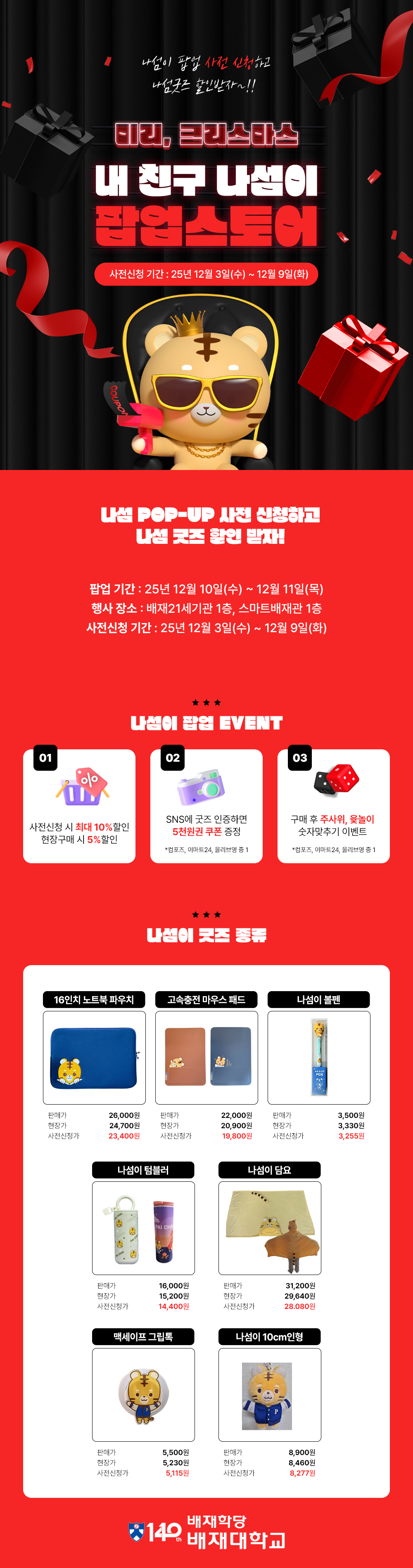재학생 만족도 향상 기여와 대학 브랜드 가치 제고를 위하여 배재대학교 마스코트 '나섬이'를 활용한 굿즈 팝업 스토어를 운영하오니 많은 관심 부탁드립니다.