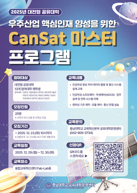 제목[대전형 공유대학] 비교과 프로그램 참여학생 모집(충남대학교 우주산업 핵심인재 양성을 위한 CanSat 마스터 프로그램)