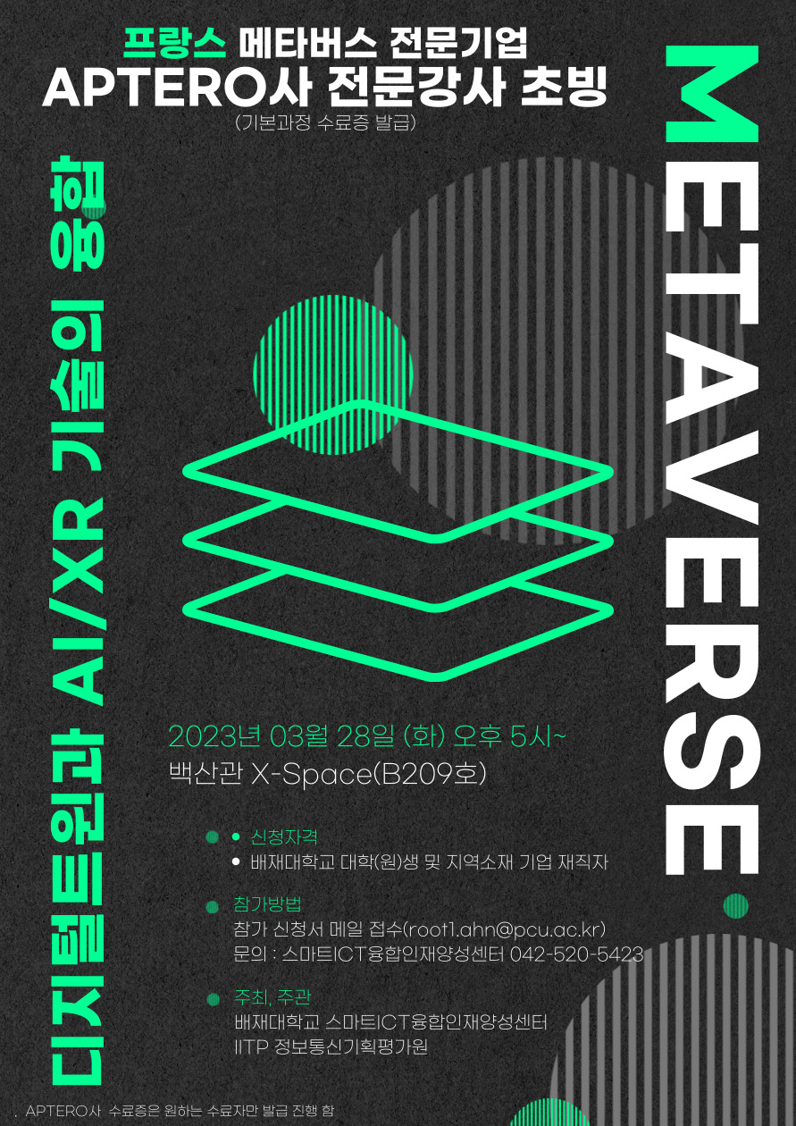 제목디지털트윈과 AI/XR 기술로 융합된 메타버스의 세계(프랑스 메타버스 전문기업 Aptero사 CEO 초빙) 특강안내[접수 마감]