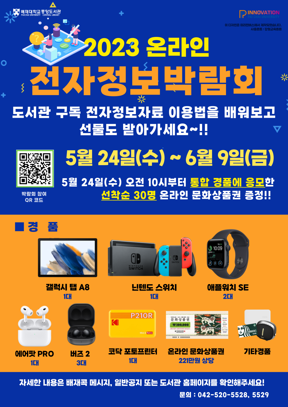 - 5.24(수) 오전 10시부터 오픈되는 전자정보박람회 이벤트 페이지 접속 → 전자정보자료 부스별 퀴즈 이벤트 응모 → 경품응모 완료!!